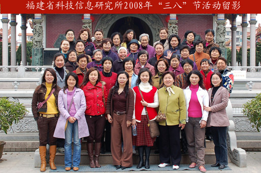 2008年3月7日,為慶!叭恕眹(guó)際勞動(dòng)?jì)D女節(jié),省科技信息研究所婦委會(huì)組織女職工前往長(zhǎng)樂(lè)顯應(yīng)宮、鄭和公園等地參觀學(xué)習(xí),開(kāi)闊眼界,增長(zhǎng)知識(shí)。全所在職、離退休女職工共47人(其中還有80高齡的老同志)參加了活動(dòng)。在參觀學(xué)習(xí)過(guò)程中,通過(guò)有關(guān)人員的詳細(xì)講解和現(xiàn)場(chǎng)參觀咨詢,全所女職工深入了解了歷史古跡的規(guī)模現(xiàn)狀、建設(shè)歷史等方面的知識(shí),深切領(lǐng)會(huì)了其中的文化內(nèi)涵和領(lǐng)略了古代建筑的魅力。通過(guò)此次活動(dòng),進(jìn)一步豐富了女職工的文化生活,促進(jìn)溝通和交流,增進(jìn)團(tuán)結(jié)和協(xié)作,受到大家的一致好評(píng)。