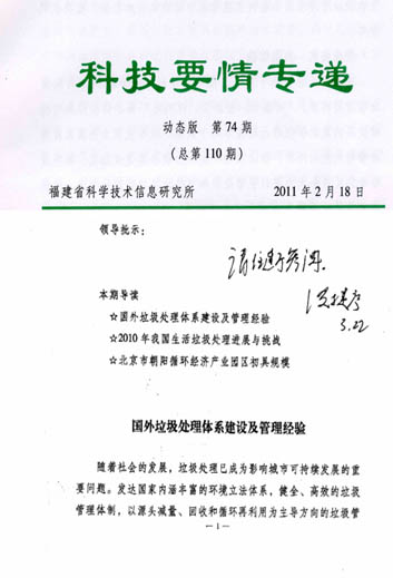《科技要情專遞》動態(tài)版第74期發(fā)表了我所研究人員編撰的“國外垃圾處理體系建設及管理經驗”一文及選編的“2010年我國生活垃圾處理進展與挑戰(zhàn)”和“北京市朝陽循環(huán)經濟產業(yè)園區(qū)初具規(guī)!眱善獎討B(tài)信息。該專輯文章重點介紹了發(fā)達國家垃圾處理的減量循環(huán)管理理念、環(huán)境立法體系、宣傳教育機制、監(jiān)管體制、先進技術等方面的措施和經驗,指出了目前我國垃圾處理的現狀和面對的困難,推薦了北京市循環(huán)經濟產業(yè)園區(qū)的運作實例,力圖為我省城鄉(xiāng)垃圾處理和管理體系建設提供參考信息。這次省領導的批示,是對我們工作的進一步肯定和鼓勵。我們將繼續(xù)努力,為海西科技發(fā)展和領導決策提供高質量的情報服務。