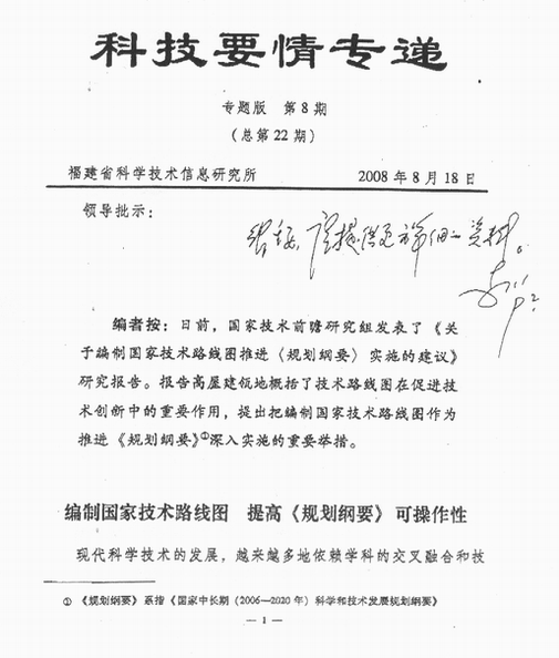 9月2日,李川副省長對省科技信息研究所創(chuàng)辦的《科技要情專遞》專題版第8期刊出的《編制國家技術路線圖,提高<規(guī)劃綱要>可操作性》一文作出重要批示:“很重要,請?zhí)峁└敿毜馁Y料”。接到批示件后,省科技信息研究所立即組織人員落實李川副省長的批示精神,著手相關資料的收集與深入分析。