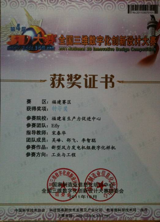 會(huì)上對(duì)2011年度第四屆全國(guó)三維數(shù)字化創(chuàng)新設(shè)計(jì)大賽復(fù)賽作品近80余件作出評(píng)審,我中心Efly團(tuán)隊(duì)以“新型風(fēng)力發(fā)電機(jī)組數(shù)字化樣機(jī)”參賽作品,獲得福建賽區(qū)工業(yè)與工程組特等獎(jiǎng)。至此,省生產(chǎn)力中心已連續(xù)三年獲得該賽事獎(jiǎng)項(xiàng)。